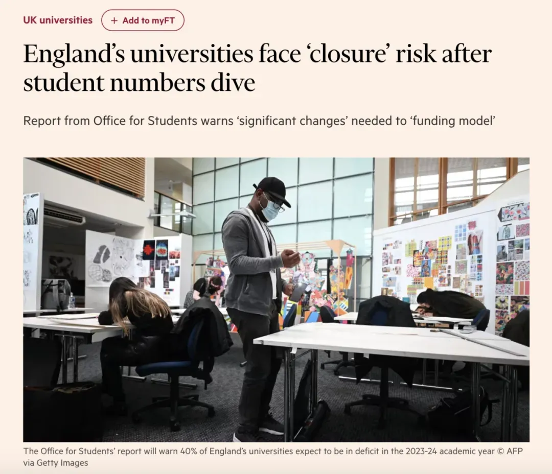 毕竟这一年来,英国大学面临破产的新闻一直没有停过。根据官方年度报告预计,2023-24学年英国40%的大学将出现赤字。
