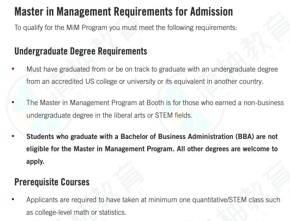 以芝加哥大学管理学硕士举例,该项目本身不招收工商管理学学位 (BBA) 的学生,并且要求申请者必须至少修过一门定量或STEM课程,例如大学数学或统计学。