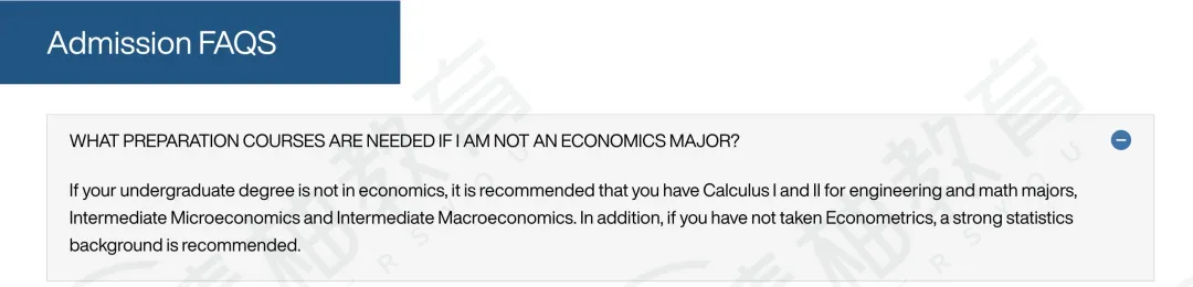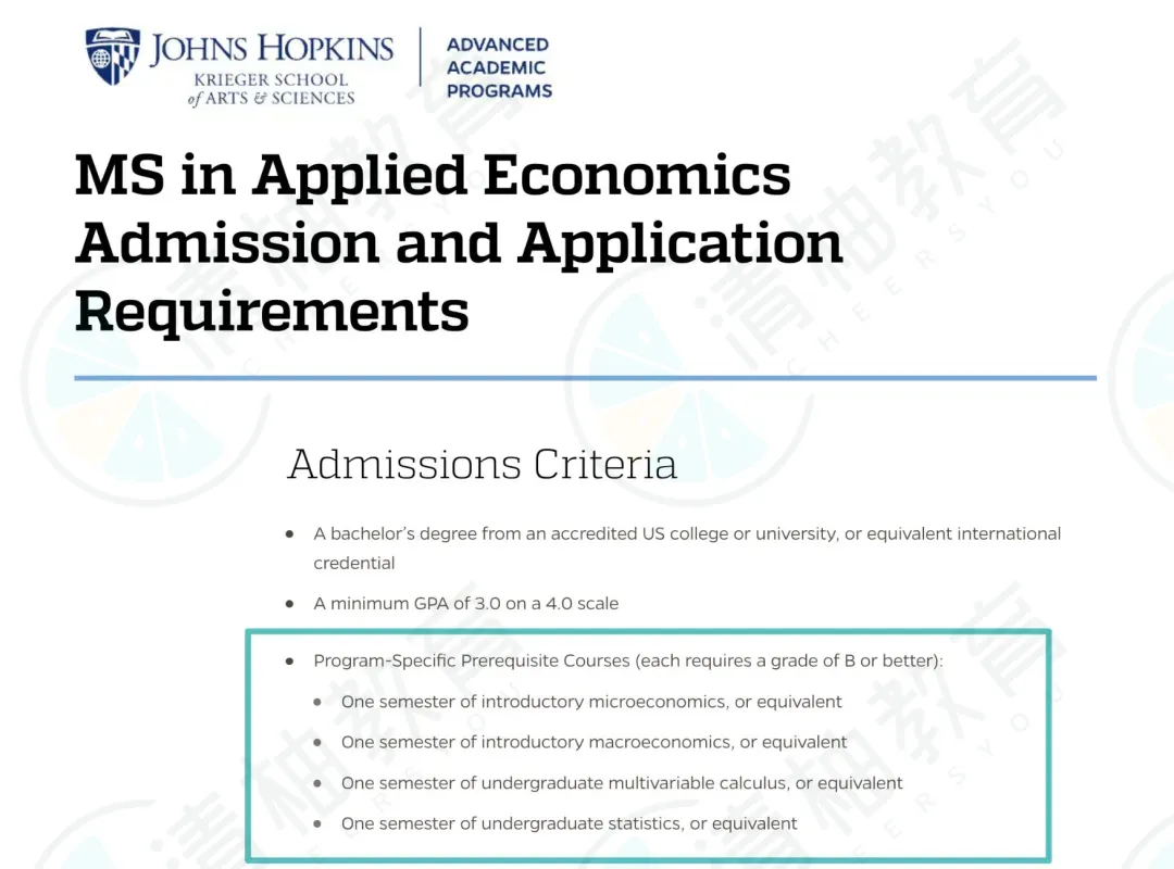 该方向不少项目也有一定前置课要求。以约翰霍普金斯大学为例,其MAE项目除了对经济领域相关课程有要求外,同时对数学和统计课程均有一定要求。