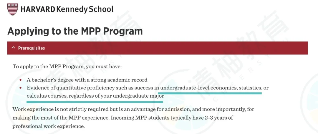 公共政策项目对于申请者的背景也会有一定要求。拿哈佛大学的MPP为例,该项目明确表示申请者必须在经济,统计,代数相关领域有一定本科课程背景,且要求申请者必须有2-3年的工作经历。