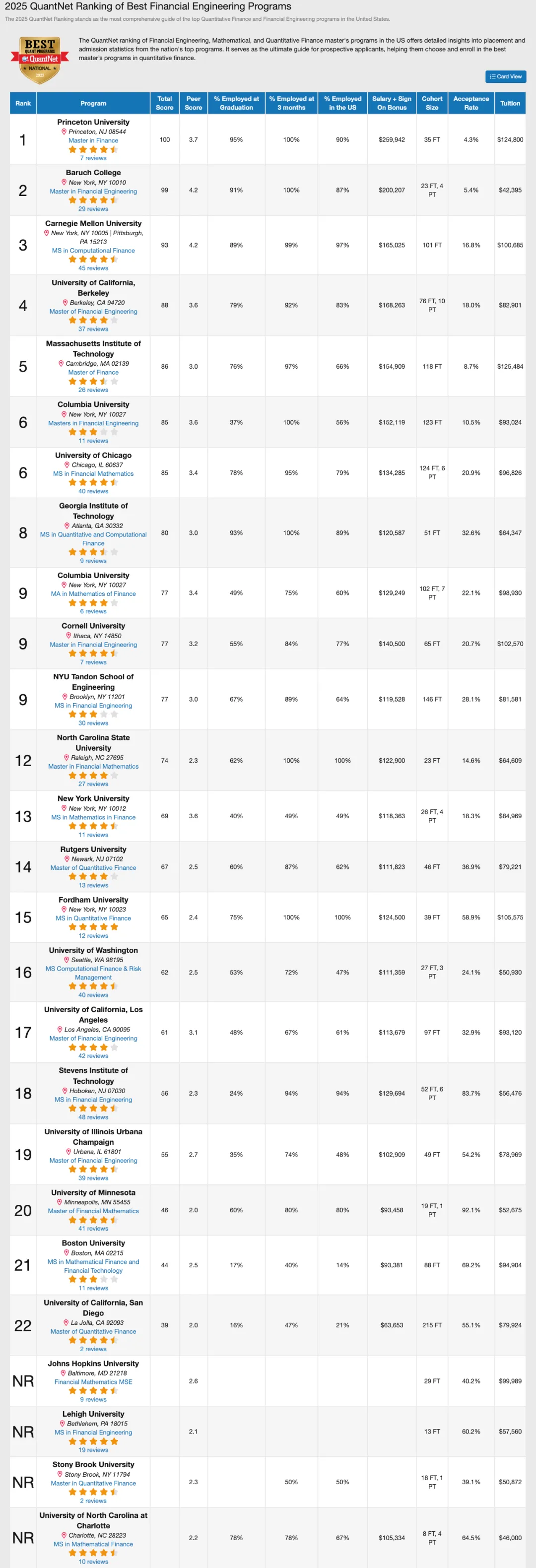 近日,QuantNet最新发布2025年全美金融工程项目最新排名!