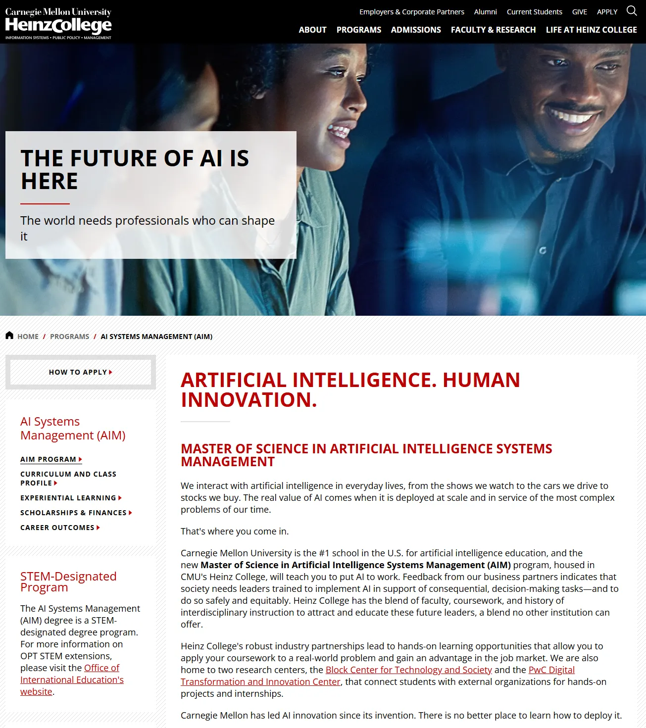 人工智能系统管理理学硕士课程是一门全日制课程,学制为1-1.5年,满足了不同学生的要求。此外,该项目开设在海因茨学院下,拥有强大的师资力量和行业合作伙伴关系,可以为学生提供实践学习机会,让他们将课程应用于实际问题并在就业市场中获得优势。