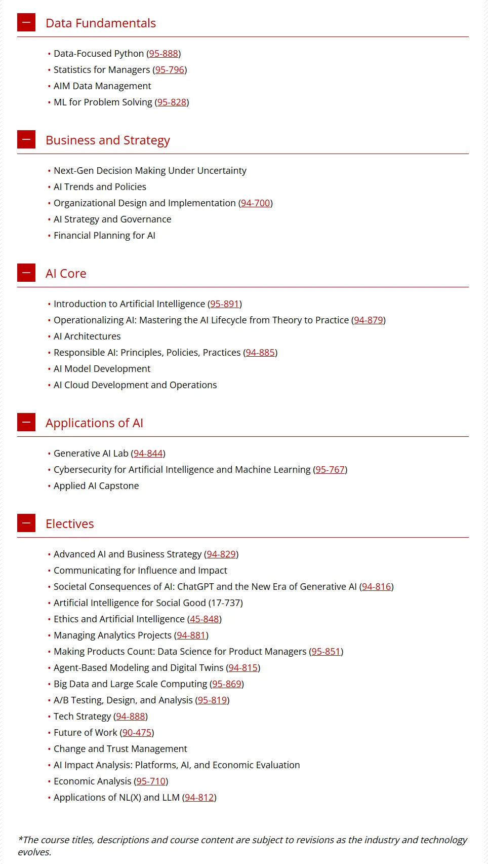 该项目的课程十分全面,涵盖了人工智能领域的各个方面。核心课程Python数据基础知识、人工智能趋势与政策、人工智能模型开发等等。课程设置方面还格外注重将理论运用于实际,学生们可以在生成人工智能实验室进行实证研究学习。此外,还开设了例如伦理与人工智能的选修课,学生们可以根据自己的兴趣爱好选修相应课程。