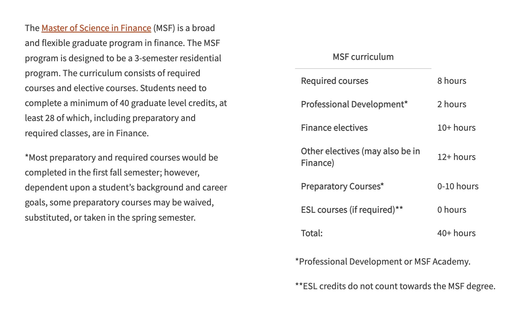 MSF项目要求完成至少40个研究生学分,其中至少28个学分为金融课程,包括准备课程和必修课程。