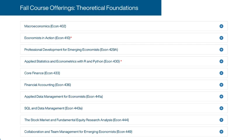 9-18个月的学习时间里,学生们将要通过Python、R、SQL、Excel等基础数据处理工具来学习如何分析浩如烟海的经济数据,并且从中找到关于未来经济发展的线索指向。