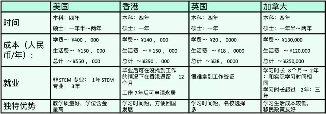 面对此类困惑,清柚整理了一份英美加港留学地区的分析对照表,来帮助大家更好地比较申请优劣势,以便选择最适合自己的留学申请计划。
