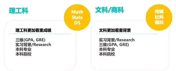 不同专业对于GRE的申请要求也会有所不同。理工科如Math, Stats, DS对学生包括GRE成绩在内的三维背景更加关注;而文科/商科类的专业会对学生的实习科研背景更加看重。