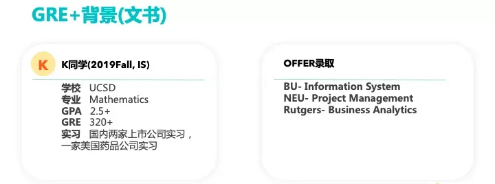 像清柚的K同学,他的GPA只有可怜的2.5+,但由于他GRE的高分加上丰富的实习背景,清柚在文书上下足了功夫,最终帮助他申进了一般都会GPA卡3.0的Top50名校。