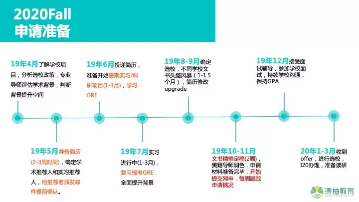 以下是清柚为大家推荐的2020 Fall申请准备进度表,希望大家把握时间节点,千万不要被GRE拖累了申请。