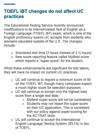 不仅如此,加州大学系统还表示他们将继续只接受最高的单次托福成绩,和SAT/ACT一样,UC不接受拼分。