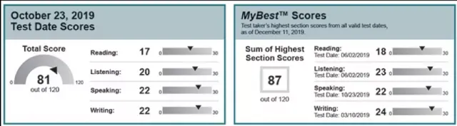 另外,为了帮助学生达到自己想要的目标分数,ETS还将在托福报告中添加一个MyBest Scores成绩。