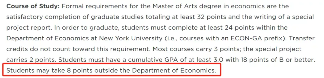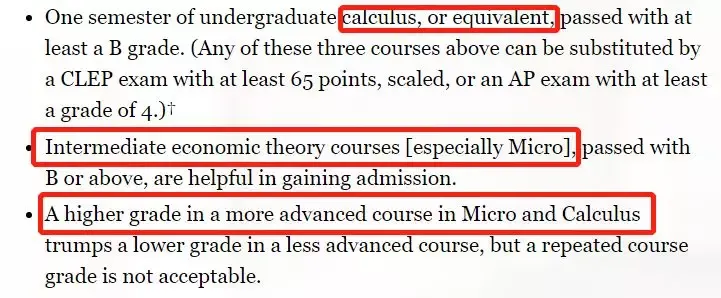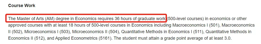 其中经济学硕士项目要求至少32学分,通过八门课程获得。其中四门课程是核心课程,其余四门课程可以从各种选修课程中获得,部分课程包括: