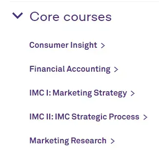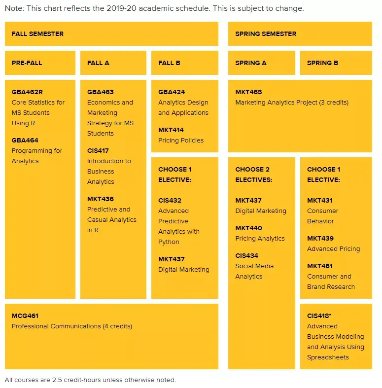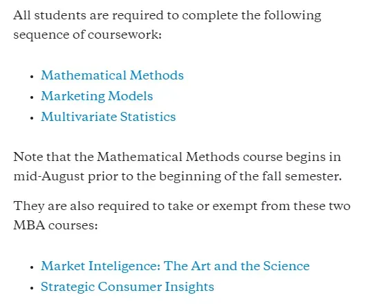 该项目要求学生必须完成至少十门完整的研究生程度课程(30学分):5门核心课程,两门市场营销MBA课程以及至少两门博士选修课(工程,经济学,统计学,计算机科学,心理学等)。