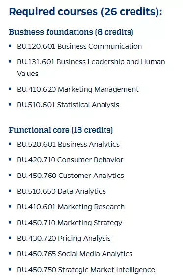 JHU的市场营销理学硕士课程旨在让学生研究市场营销行业的当前和未来趋势,利用所学知识解决大小型组织面临的现实难题。必修课包含了商业基础课程和核心实用课程两部分,除了打好学生MKT理论基础,也培养学生市场分析、营销管理方面的实际应用。