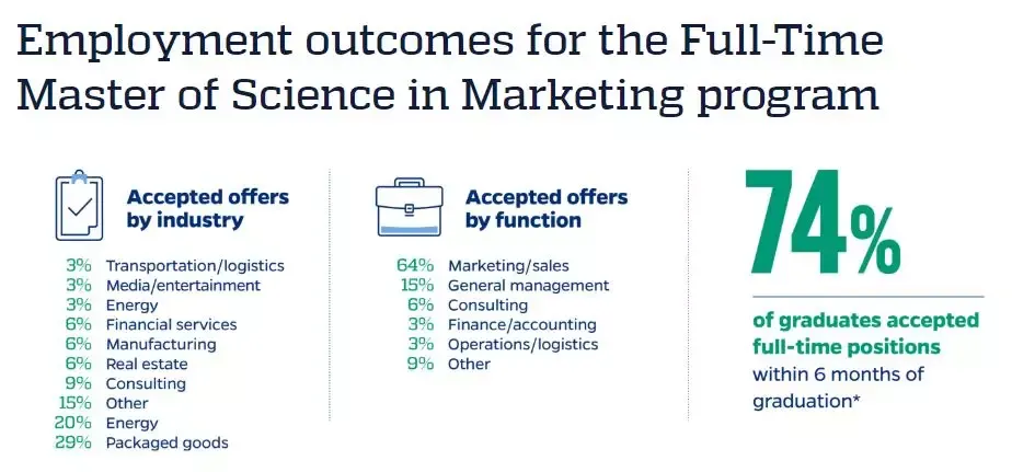 再来看看JHU的毕业生就业统计,可以更直观的看出来毕业后从事的行业和职位,其中,74%的毕业生被雇用,接受了全职或实习职位。