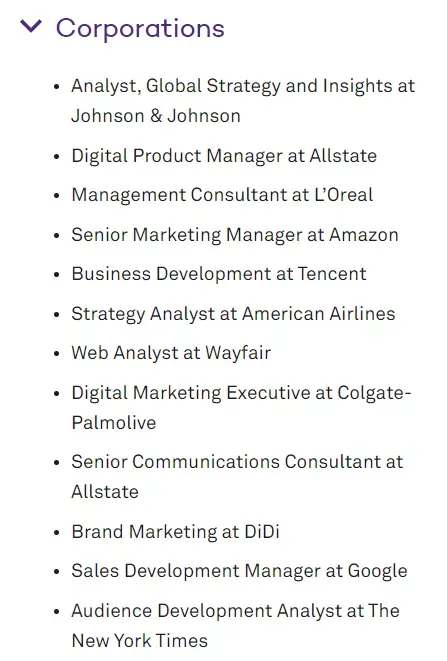 毕业生从事的几乎都是行业顶尖公司,欧莱雅、亚马逊、腾讯、滴滴、美国航空、谷歌,基本上都是产品经理、销售经理、市场咨询、市场分析、BD拓展等核心岗位。