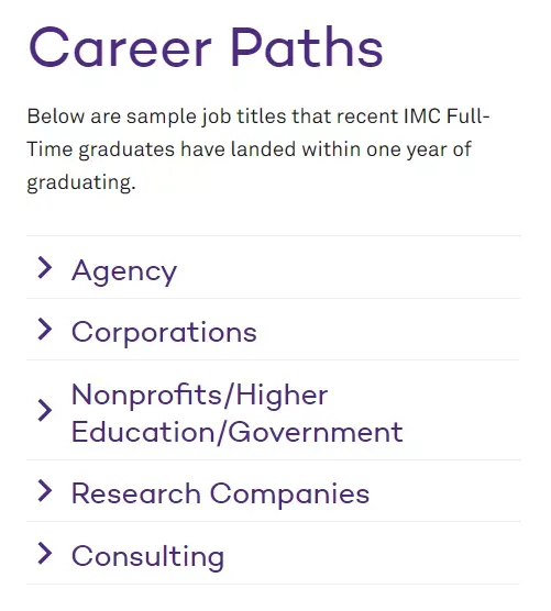 西北大学IMC的就业统计显示毕业生能去到各类公司/组织机构/政府机构/非盈利组织/教育部门/咨询公司等等,就业方向很多元。