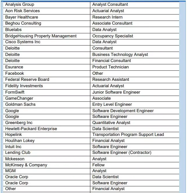 加州大学伯克利分校官网资料显示, 统计学硕士学生毕业后成功就职于亚马逊、花旗、JP Morgan、微软、德勤、Uber等各大知名公司,从事数据/定量/产品分析师等职业。
