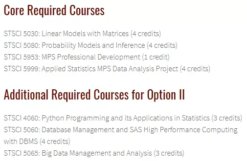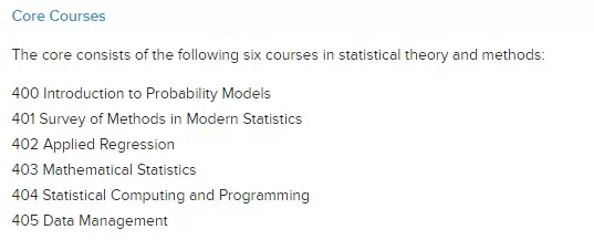 MAS学生必须获得至少44个单元的课程学分,应用统计硕士课程有一套六门必修的核心课程。此外,学生将至少选择五门强调统计建模和编程的选修课。