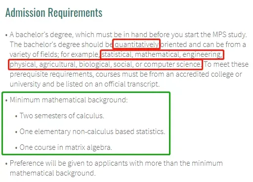 康奈尔大学MPS项目明确要求:申请的学生本科专业应以【数量】为导向,如统计/数学/工程/物理/农业/生物学/社会或计算机科学。