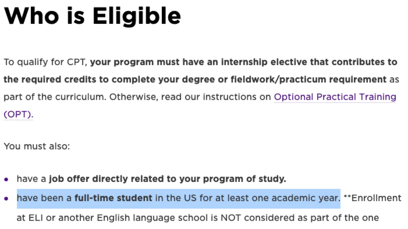 *想要申请在校CPT,需要作为全职学生完成至少一学年(9个月)的学习。