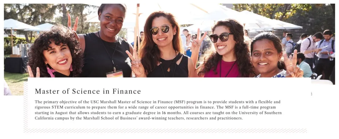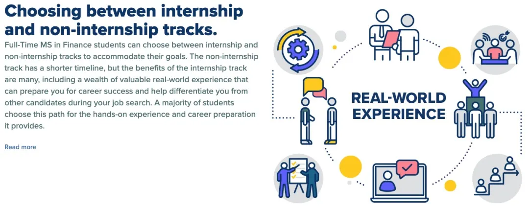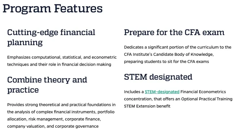 项目时长1年,36学分,是CFA导向。课程内容偏传统,理论性课程较多,也适合有相关商科基础知识的跨专业学生申请。同时,该项目为STEM,学生可享受在美三年实习工作期。