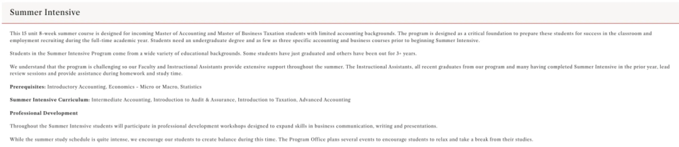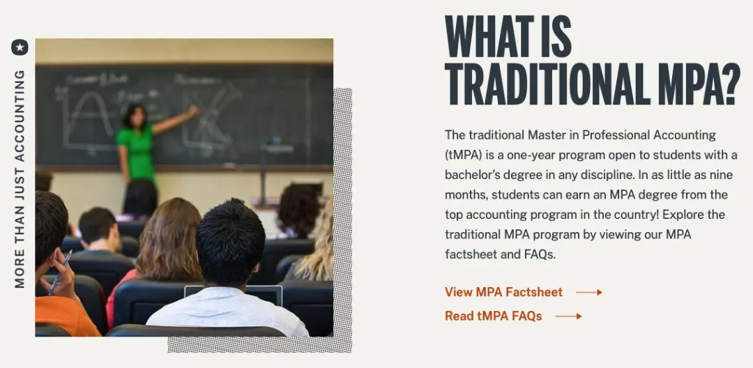 项目时长9-13个月,分为3种模式,适合不同的申请者。Traditional-MPA适合各种背景的本科学生申请。Integrated MPA专为商学院本科会计设计,而ECON-MPA项目则是适合本科主修经济学,也想获得会计硕士的学生申请的本硕连读项目。对于申请者没有专业背景限制,但要求数学能量强。