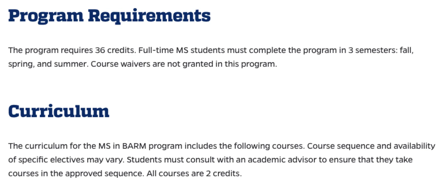 项目时长1年(16个月),为STEM项目。课程内容多为会计、资产管理、风险管理等传统内容。对申请人的本科专业没有限制。