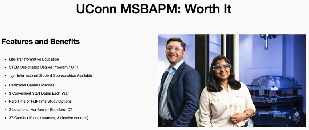 项目full-time学习可在3学期毕业。课程内容包括商业流程建模、项目风险与成本管理与数据管理和商业决策建模等课程。STEM项目,可选上课地点(Hartford vs. Stamford)。