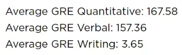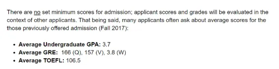申请者均需提交GRE成绩,国际生需提交托福(100+)或雅思成绩,其中官方给出GRE的平均成绩如下: