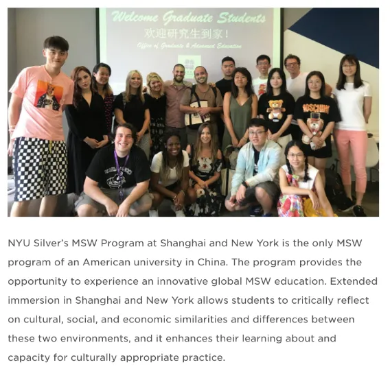 这里推荐的项目是纽约大学的Social Work,该项目时长为两年,第一年在中国上海,第二年在纽约进行学习。项目不但学习地点自由,学校也提供实习机会,整体项目的含金量非常高。
