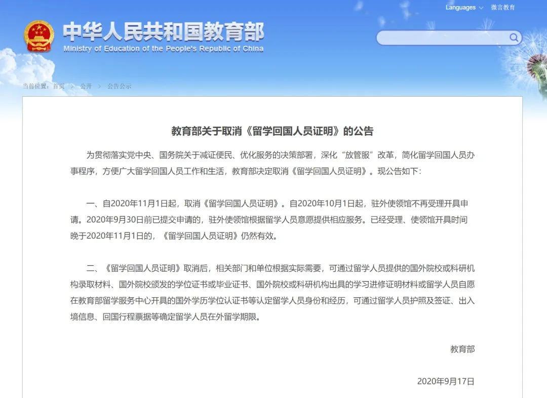 2020年9月17日,教育部发布关于取消《留学回国人员证明》的公告。