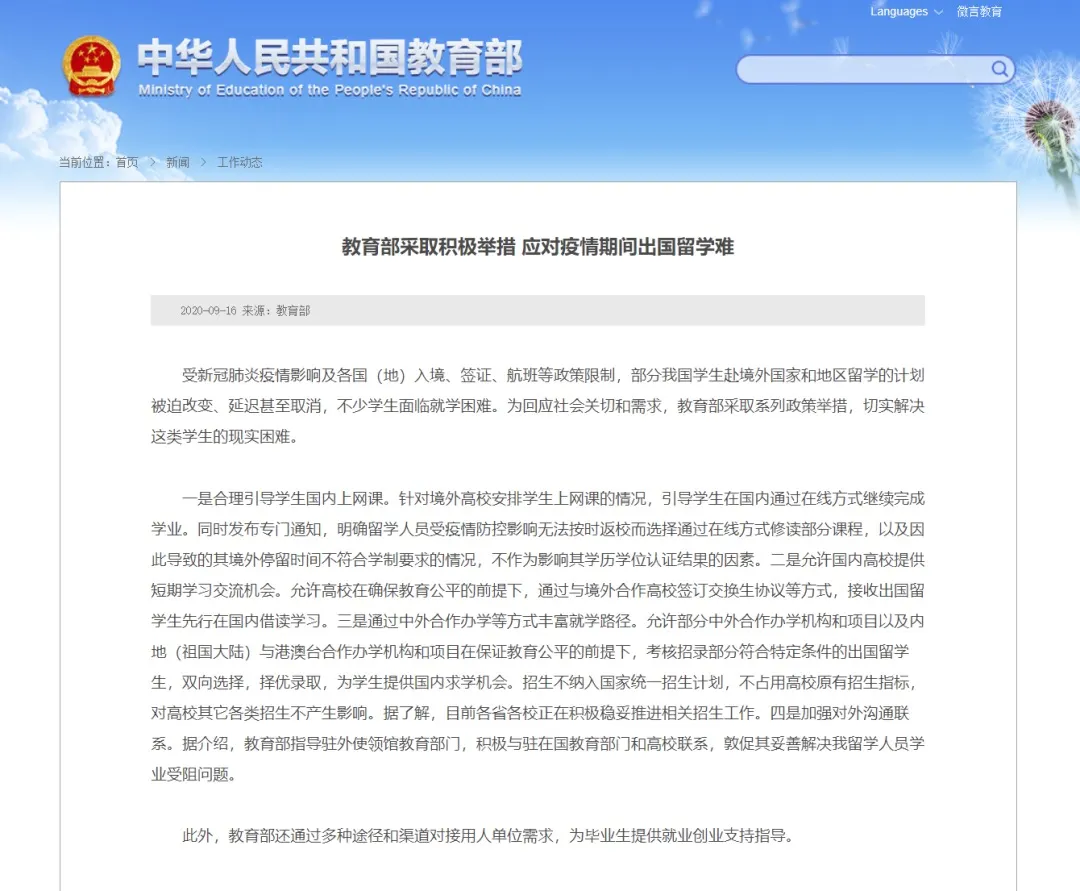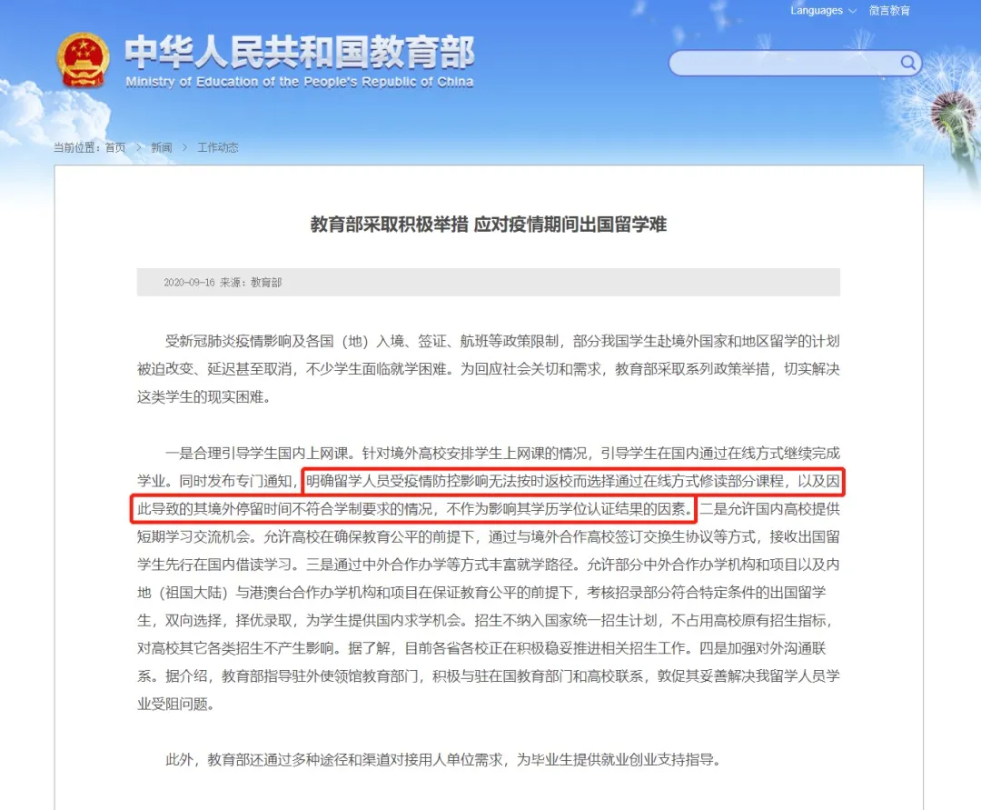 2020年9月16日,教育部宣布留学生在国内上网课将不影响学历认证,并且允许中外合作办学扩招受阻出国留学生。