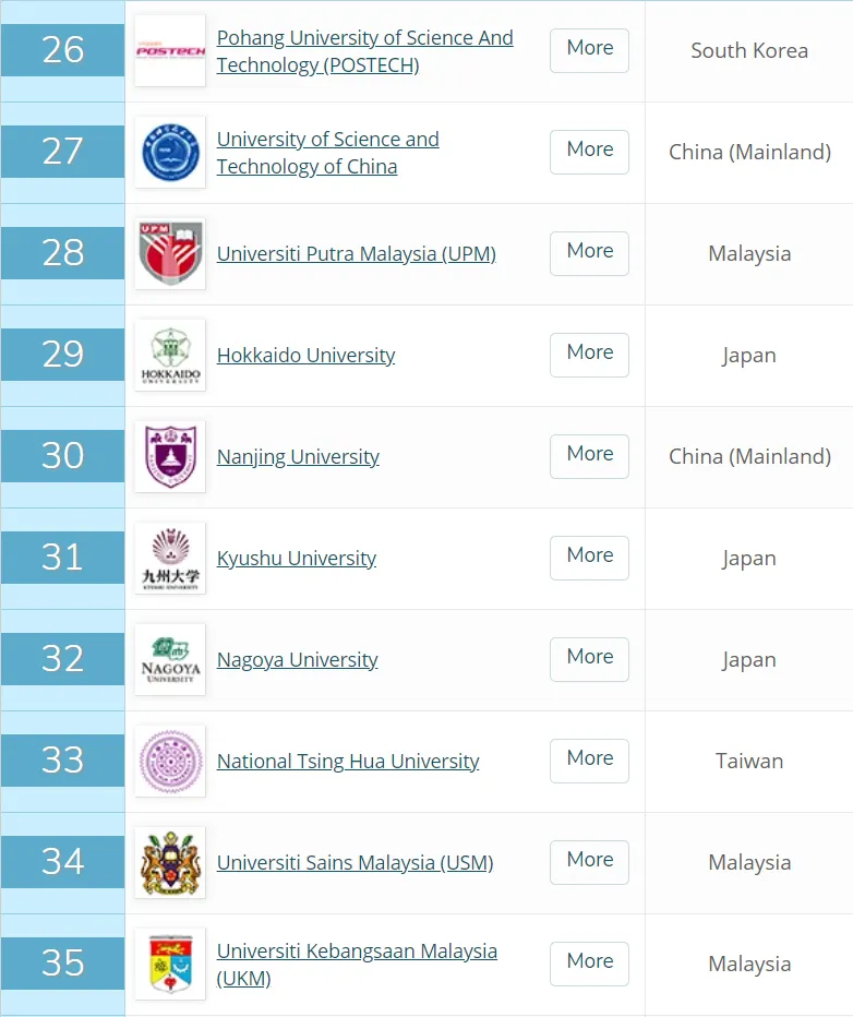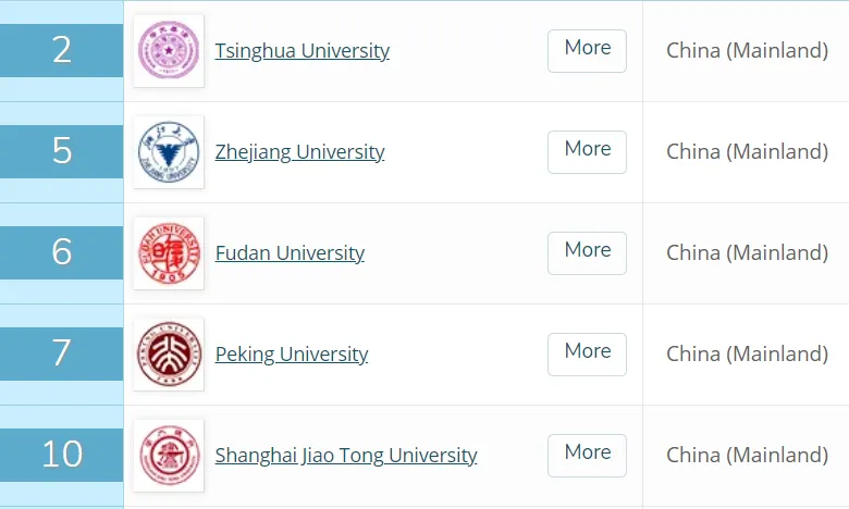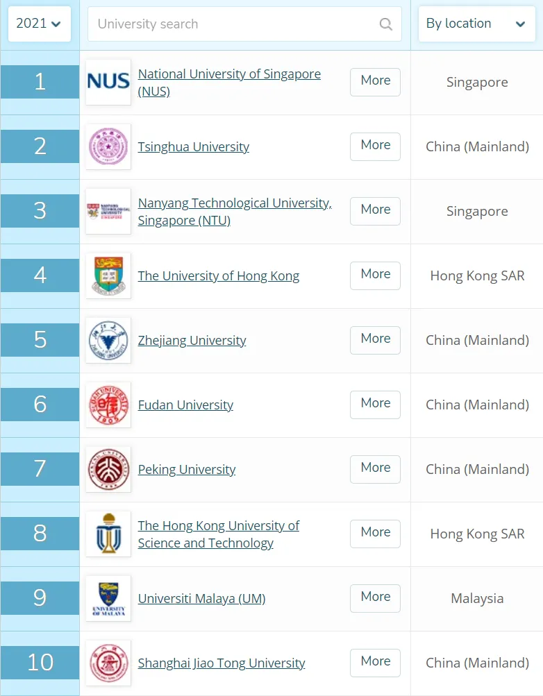 新加坡国立大学、清华大学、新加坡南洋理工大学、香港大学、浙江大学、复旦大学、北京大学、香港科技大学、马来西亚大学、上海交通大学。