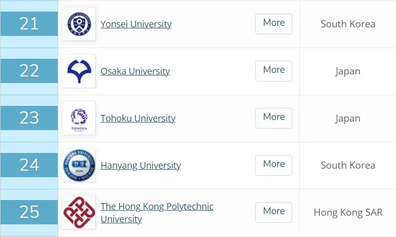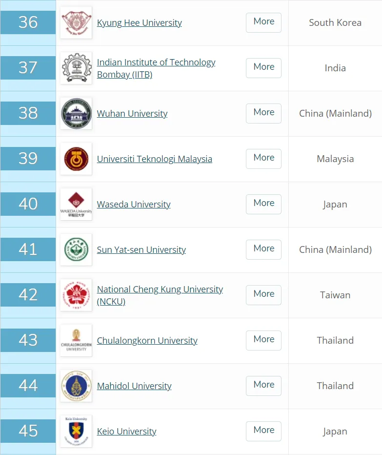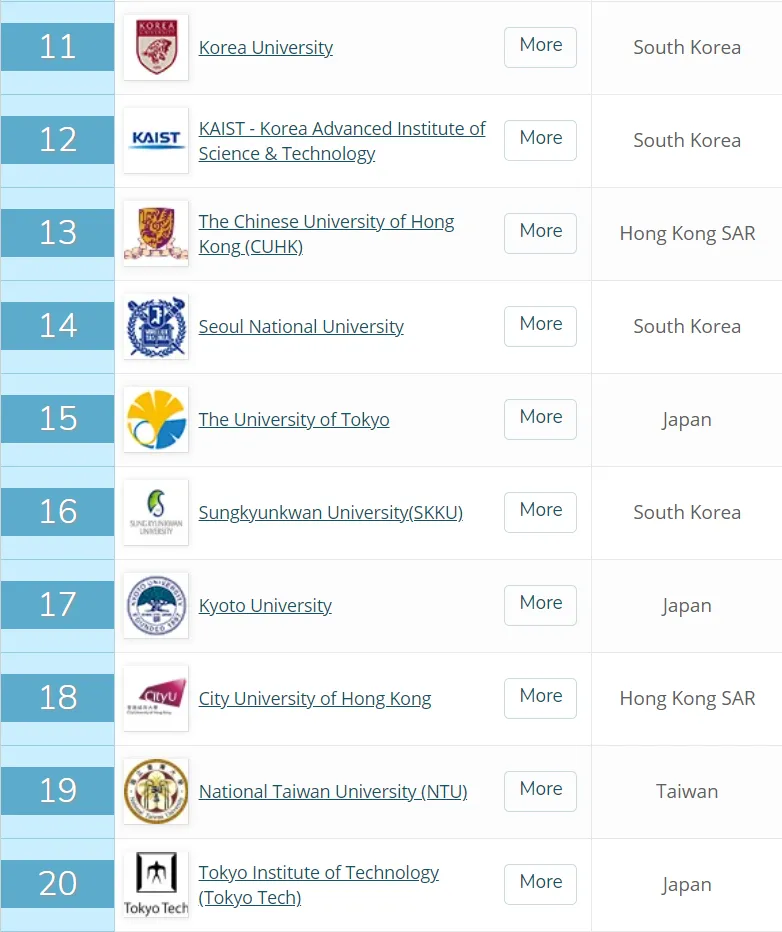 共18个亚洲国家/地区的大学上榜。其中,中国大陆高校上榜124所、中国香港地区上榜8所、中国澳门地区上榜2所、中国台湾地区上榜43所,日本上榜105所,韩国上榜88所,新加坡上榜3所,马来西亚上榜35所,泰国上榜21所。