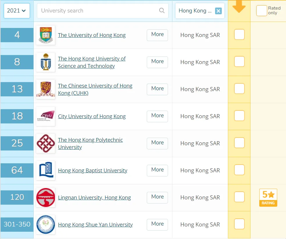 中国香港地区共有8所大学上榜:香港大学、香港科技大学、香港中文大学与香港城市大学进入亚洲前20名,整体排名比较稳定。