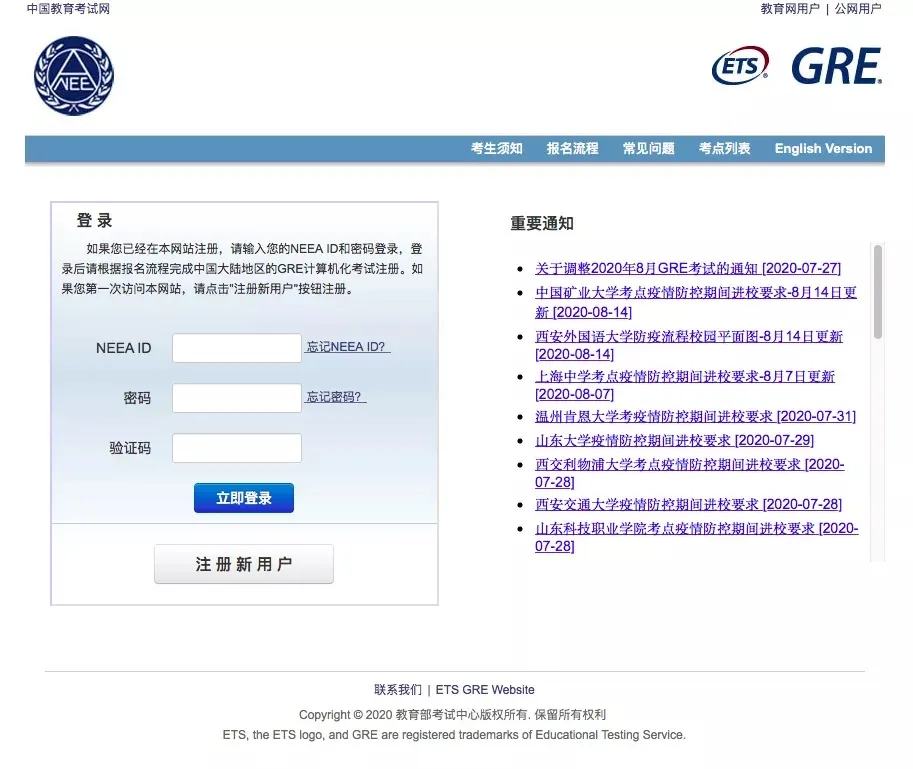 登录NEEA GRE报名官网: