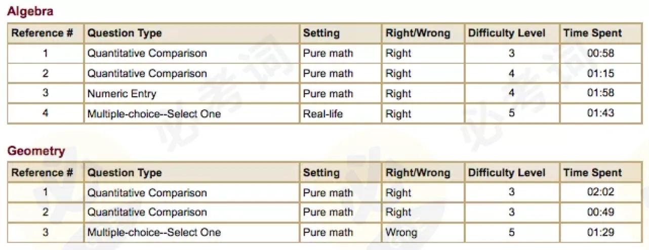 Quantitative部分,W同学的做题节奏依然掌控得非常好,大部分题目都能在一分半内完成。两个section都仅错一道题,并且都为难度系数5的难题。
