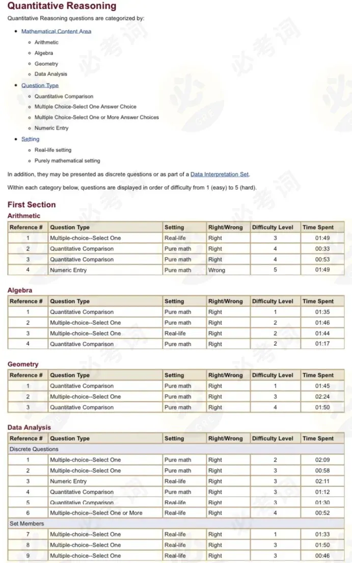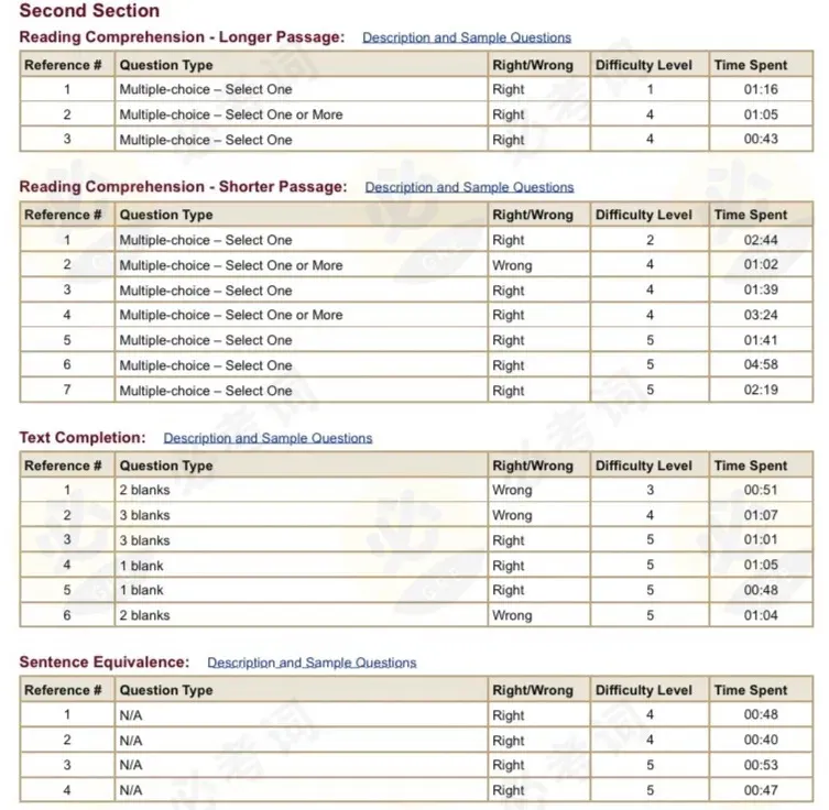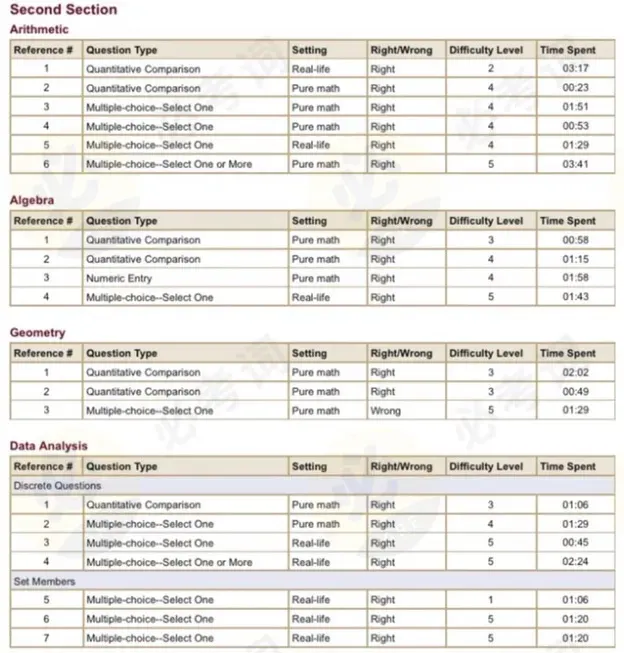 虽然这份报告没有重现考场上的具体题目,但清楚地展现了算分的Section序号、题目类型、对错、难度系数以及做题时间。考生可以据此复盘不同题目的答题情况来调整未来的考试策略。