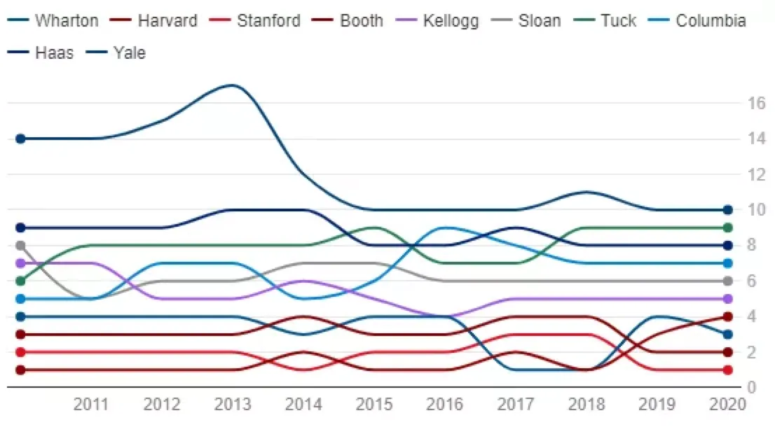 总体排名有所变化,但基本变化幅度不大。今年,哈佛商学院(Harvard Business School)的排名下滑至历史最低水平,较去年下滑一位,降至第四名。