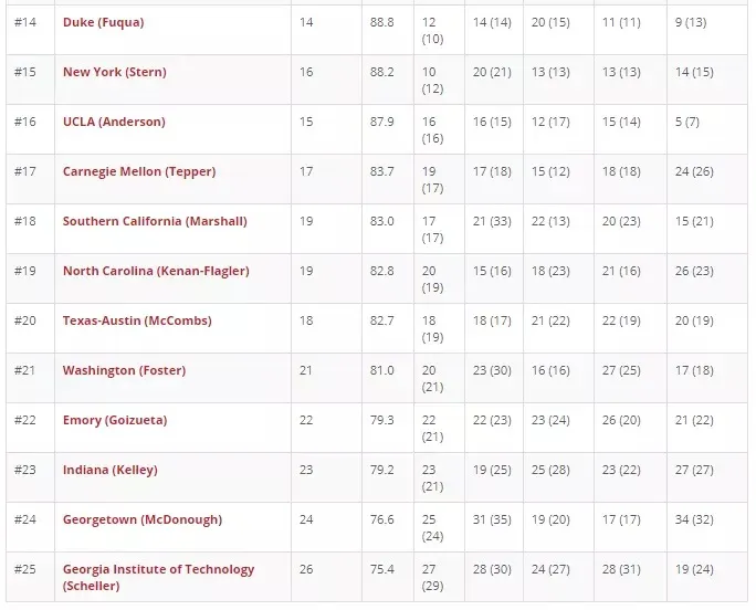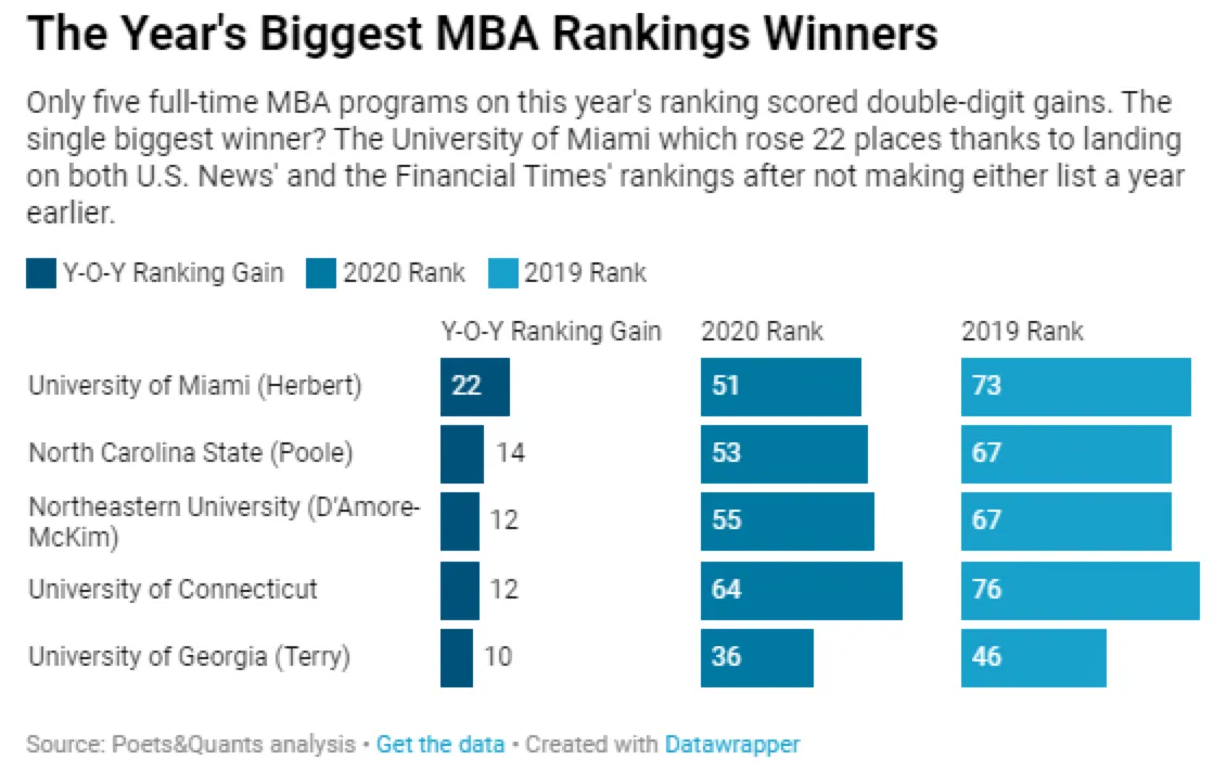 在今年的排名中,只有五个全日制MBA课程获得了两位数增长的提高,分别为迈阿密大学、北卡罗来纳州立大学、康涅狄格大学、东北大学和乔治亚大学。
