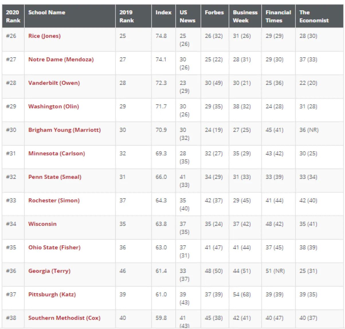 但今年由于COVID-19的影响,Businessweek今年决定不发布排名。而The Economist也推迟了排名的公布,并且斯坦福大学、哈佛大学、沃顿商学院、麻省理工学院、芝加哥大学、凯洛格商学院和哥伦比亚大学也由于今年疫情的原因,没有参加排名。