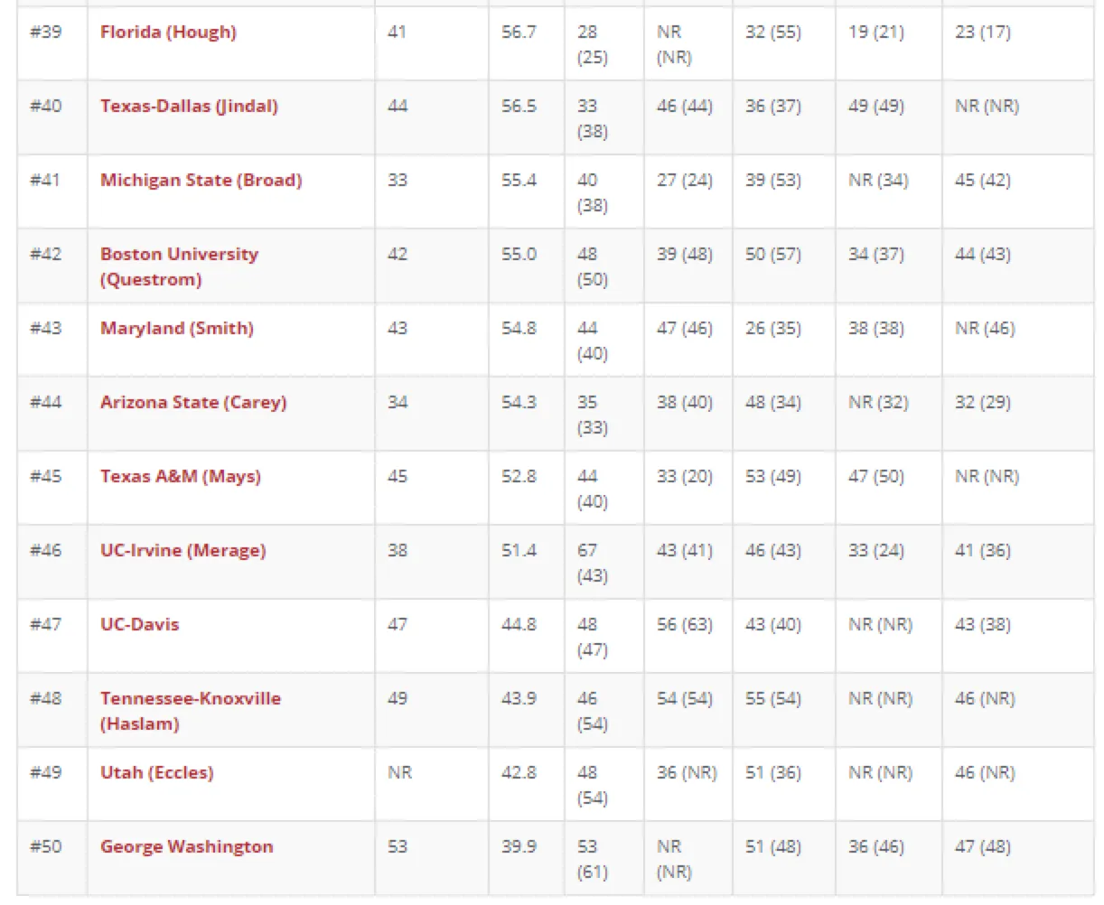 最大的赢家当今年排名51的迈阿密大学莫属,排名上升了22位。这是因为迈阿密大学一年前,没有入选USNews和Financial Times的排名。