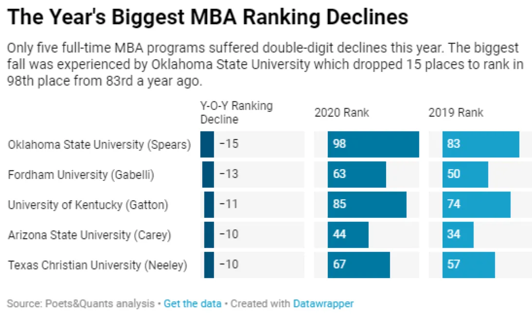 今年,只有五个全日制MBA课程的学校排名了呈现双位数的下降,分别为俄克拉荷马州立大学、福特汉姆大学、肯塔基大学、亚利桑那州立大学、德州基督教大学。