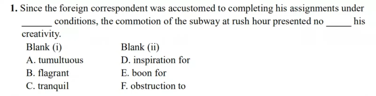 现在,我们将选项代入题目。已知(i)必须为混乱相关的词,B选项意为“臭名昭著的”,所以B选项可以被排除。遵循填空唯一性,则应该选择AF组合。