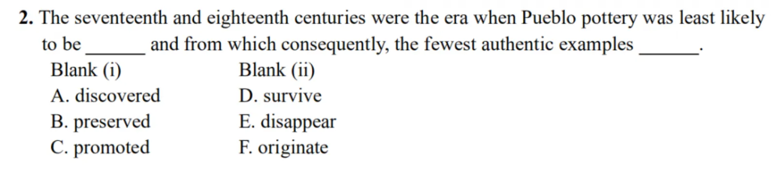 题目意为“在17和18世纪期间,Pueblo陶瓷最不可能…,并且因此最少的真实样品…”。此题中出现了“and”,指示我们此题目为并列结构。同时,and前后分别出现“least”和“fewest”在填空前,由于least和fewest都为取反词,故可以不用考虑这两个词的修饰作用。