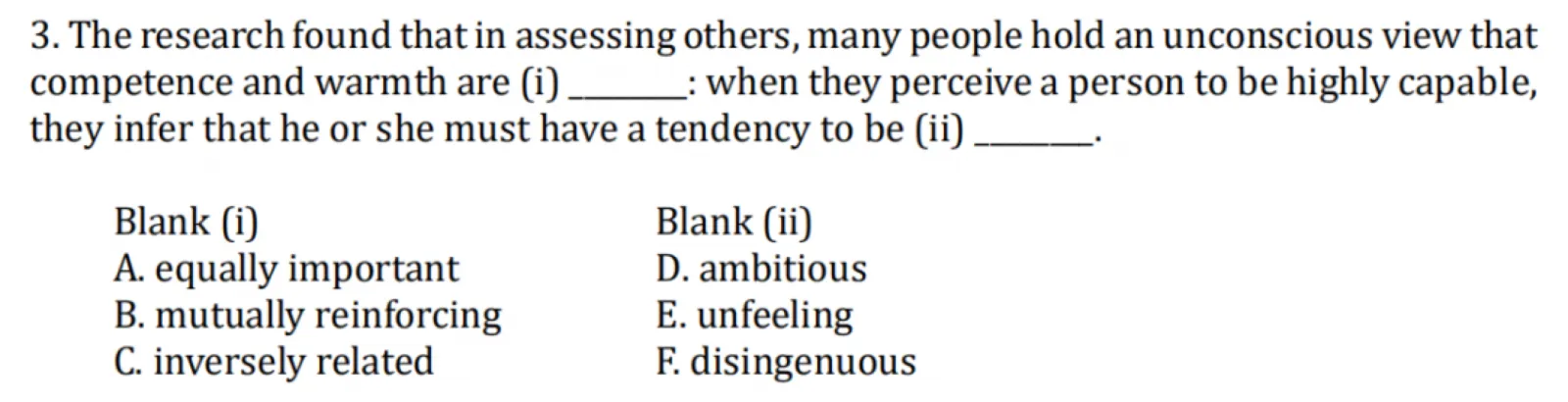 题目中的“:”表明前后为解释说明的同方向作用。由题目可知,后半句中的“highly capable”和前半句的“competence”相对应,那么我们就知道了与(ii)相对应的应该是“warmth”。此时,需要分两种情况讨论:
