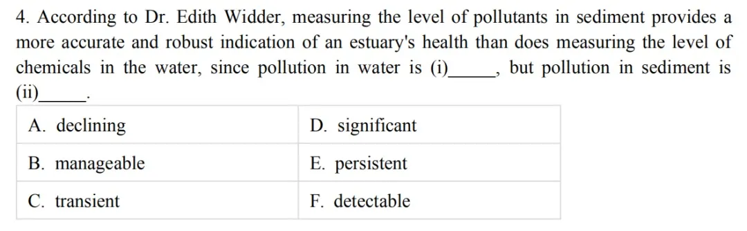 题目意为:“据Edith Widder博士,测量沉积物中的污染水平会比测量水中的污染物水平更准确更强有力地提供对于河床健康的指示,因为水中的污染物是…,但是沉积物中的污染物是…”。