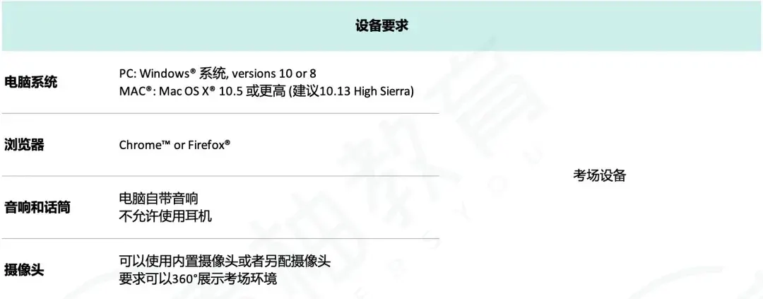 考试设备需要电脑、摄像头、麦克风、音响,耳机是不允许出现在考场中的。