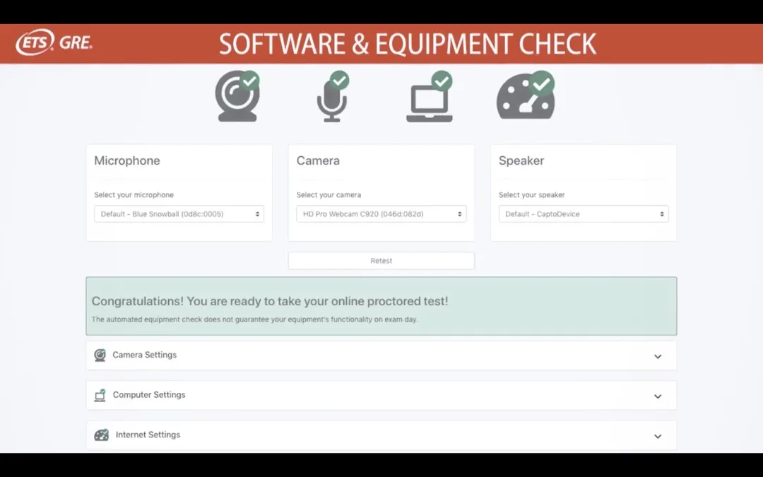 接下来请运行ProctorU Equipment Test确保电脑,摄像头,语音设备已经准备好,可以随时进行考试。